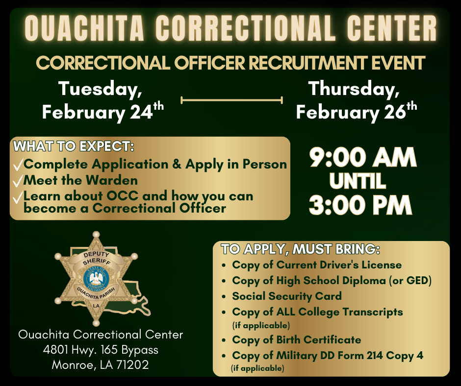 Join us for the Ouachita Correctional Center Recruitment Event: