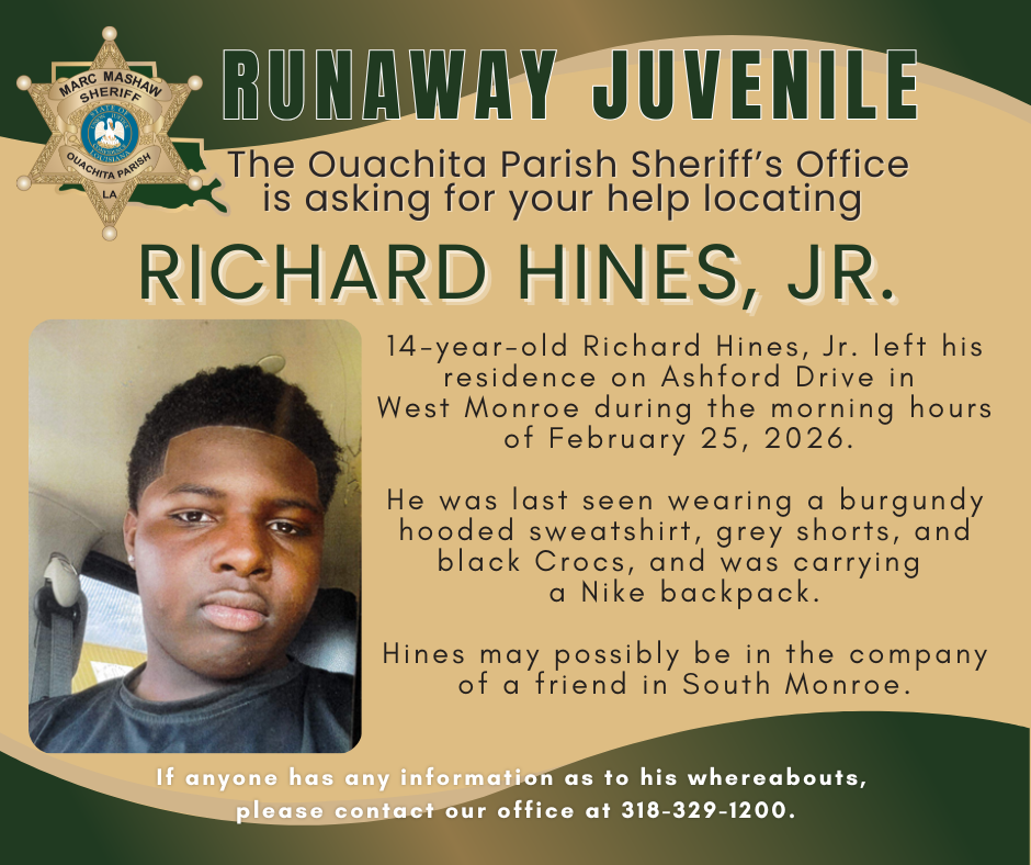 14-year-old Richard Hines, Jr. left his residence on Ashford Drive in West Monroe during the morning hours of February 25, 2026.